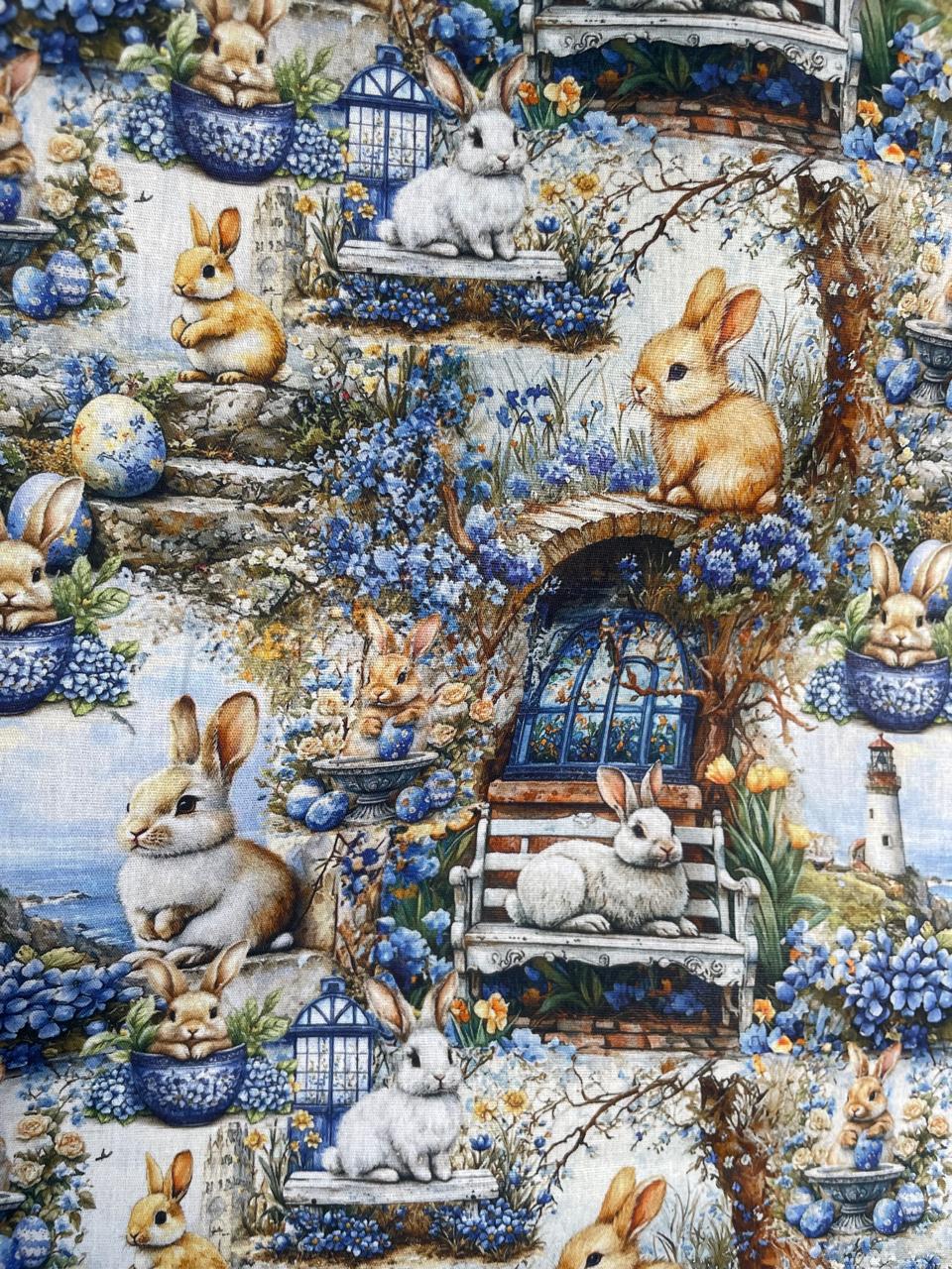 Vestuário, artesanato, decoração, barrados de toalha de mesa e panos de prato, jogos americanos, trilhos, etc. A Tricoline de Coelhinhos da Páscoa no jardim com flores azuis é um encanto!