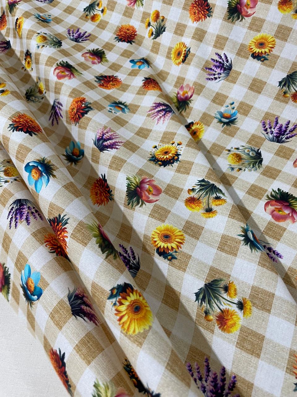 Utilização do produto: Vestuário, artesanato, decoração, barrados de toalha de mesa e panos de prato, jogos americanos, trilhos, etc. A tricoline de algodão tem muita durabilidade e cores firmes, é amplamente utilizada no vestuário e decoração da casa. A estampa de flores sobre xadrez bege é super alegre e muito bonita! Experimente e veja como esta estampa fica bonita nas roupas infantis, papéis de parede, barrados de toalhas de banho, enxovais, toalhas de mesa, guardanapos e barrados. toalhas de banho, enxovais, toalhas de mesa, guardanapos e barrados.