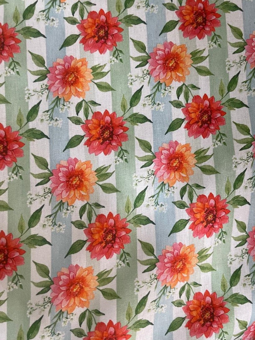 A tricoline de algodão com estampa Flores sobre Listras Azuis e Verdes é muito bonita! O tecido tem cores firmes e é pode ser utilizado no vestuário e na decoração da casa. Crie vestidos, vestes e shorts. Inove nas toalhas de mesa, guardanapos, suplás, jogos americanos, fronhas e barrados.