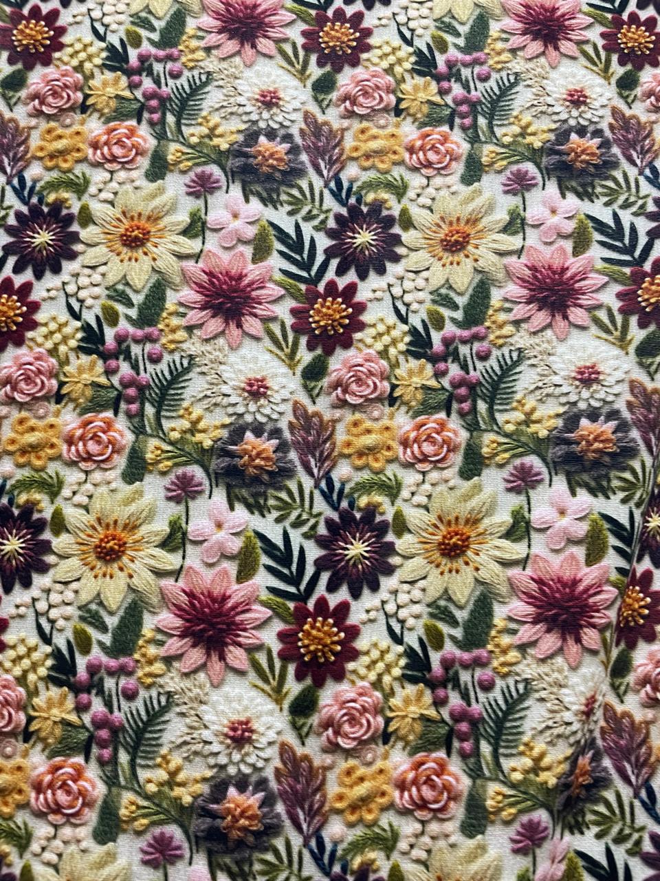 Vestuário, artesanato, decoração, barrados de toalha de mesa e panos de prato, jogos americanos, trilhos, etc. Esta estampa floral 3D é discreta e bonita e proporciona trabalhos lindos. Experimente e veja como esta estampa fica bonita nas toalhas de mesa, guardanapos e barrados.