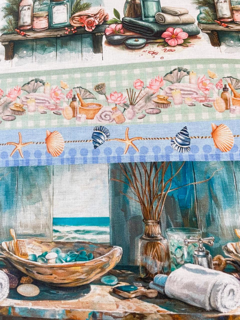 A tricoline de algodão estampa digital com 10 faixas de estampas de Banho, Mar, Perfume e Maquiagem é muito alegre e linda. Fica bonita nos barrados de toalhas de banho, de rosto, salões masculino e feminino.