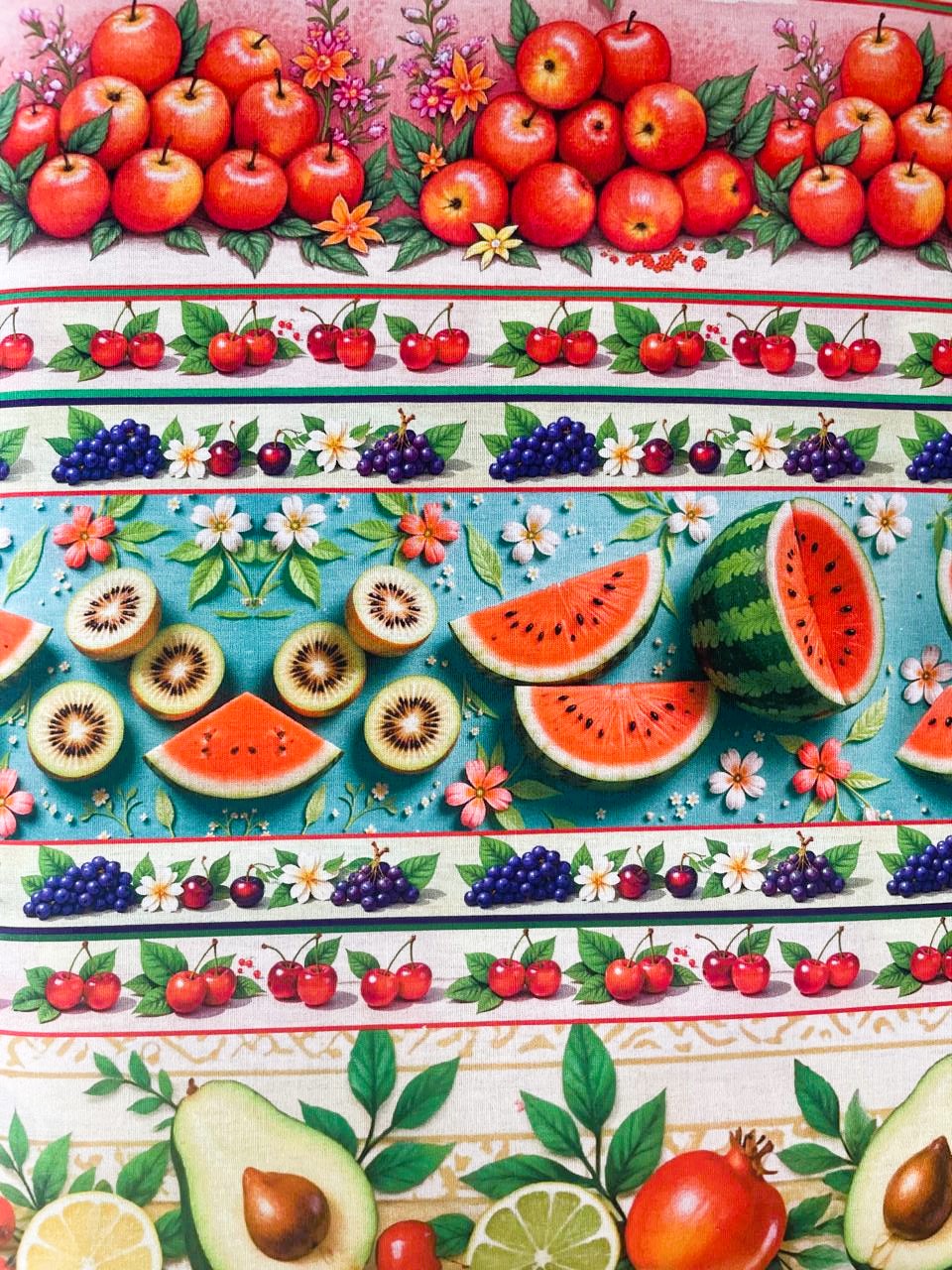 A tricoline de algodão com 10 Faixas de Estampa de Abacates, Uvas, Melancias, Romãs e outras frutas 100% Algodão é um show de beleza! O tecido tem cores firmes e é pode ser utilizado como barrado de toalhas de mesa, panos de prato, etc. Inove nas toalhas de mesa, guardanapos, suplás, jogos americanos e barrados.