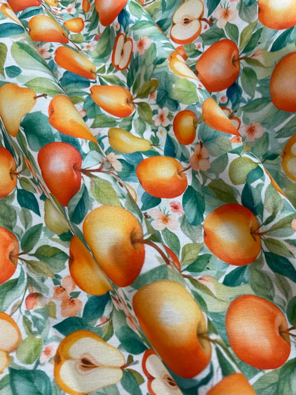 Aplicações do Tecido: A tricoline de algodão com estampa de peras e maçãs com folhagem é linda! O tecido tem cores firmes e é pode ser utilizado no vestuário e na decoração da casa. Inove nas toalhas de mesa, guardanapos, suplás, jogos americanos, e barrados.