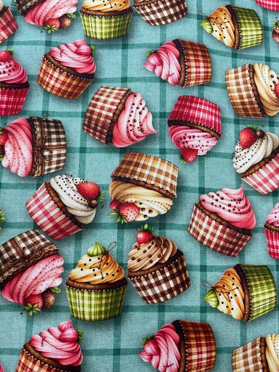 Utilização do produto: Vestuário, artesanato, decoração, barrados de toalha de mesa e panos de prato, jogos americanos, trilhos, etc. A tricoline de algodão tem muita durabilidade e cores firmes, é amplamente utilizada no vestuário e decoração da casa. A estampa de Cupcakes sobre Fundo Quadriculado em Verde é apetitosa e super bonita! Com certeza traz leveza e alegria para o seu dia a dia! Experimente e veja como esta estampa fica bonita nas roupas infantis, papéis de parede, toalhas de banho, enxovais, toalhas de mesa, guardanapos e barrados.