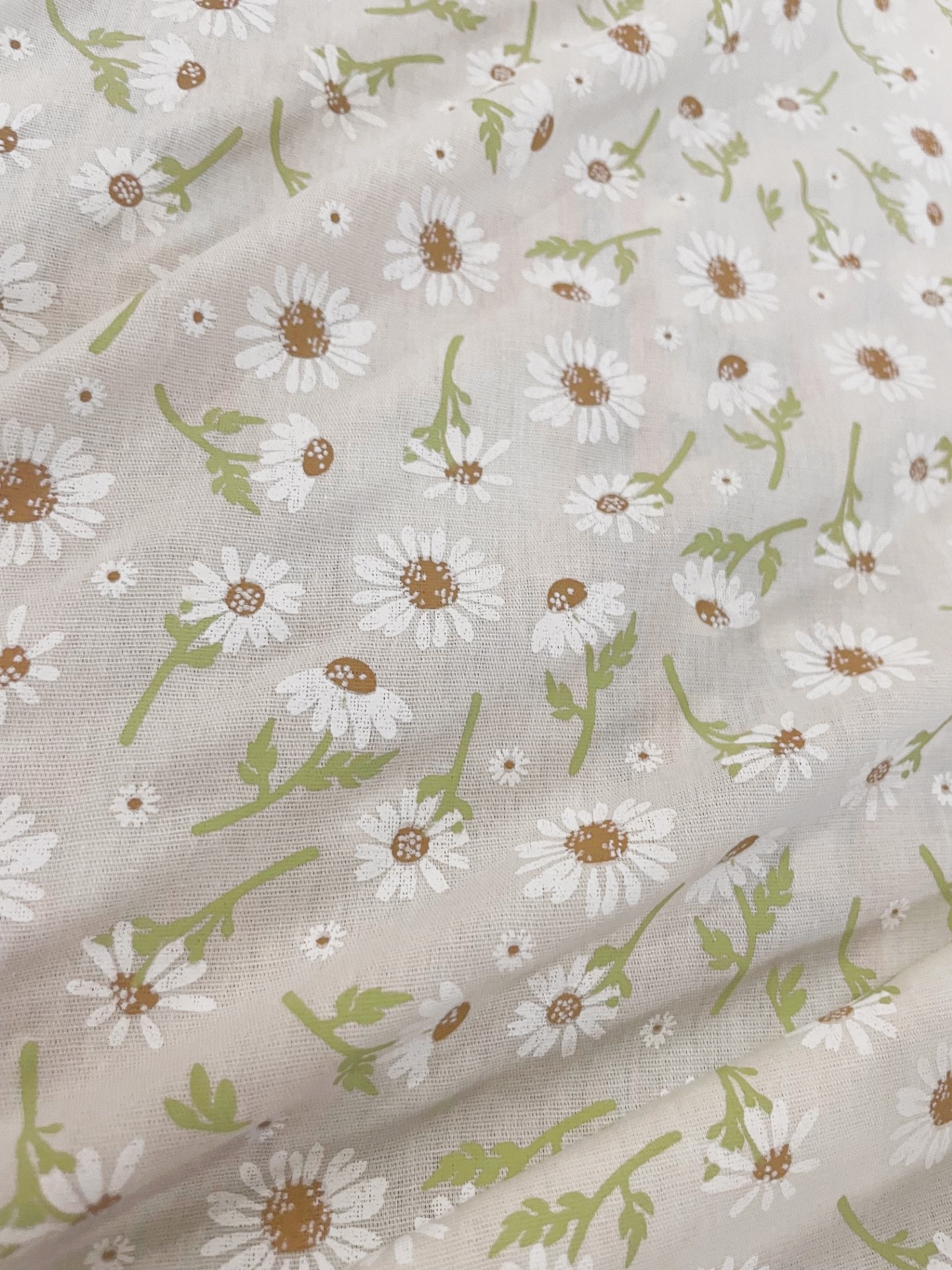 Tricoline de algodão com estampa de margaridas. Excelente para vestuário.