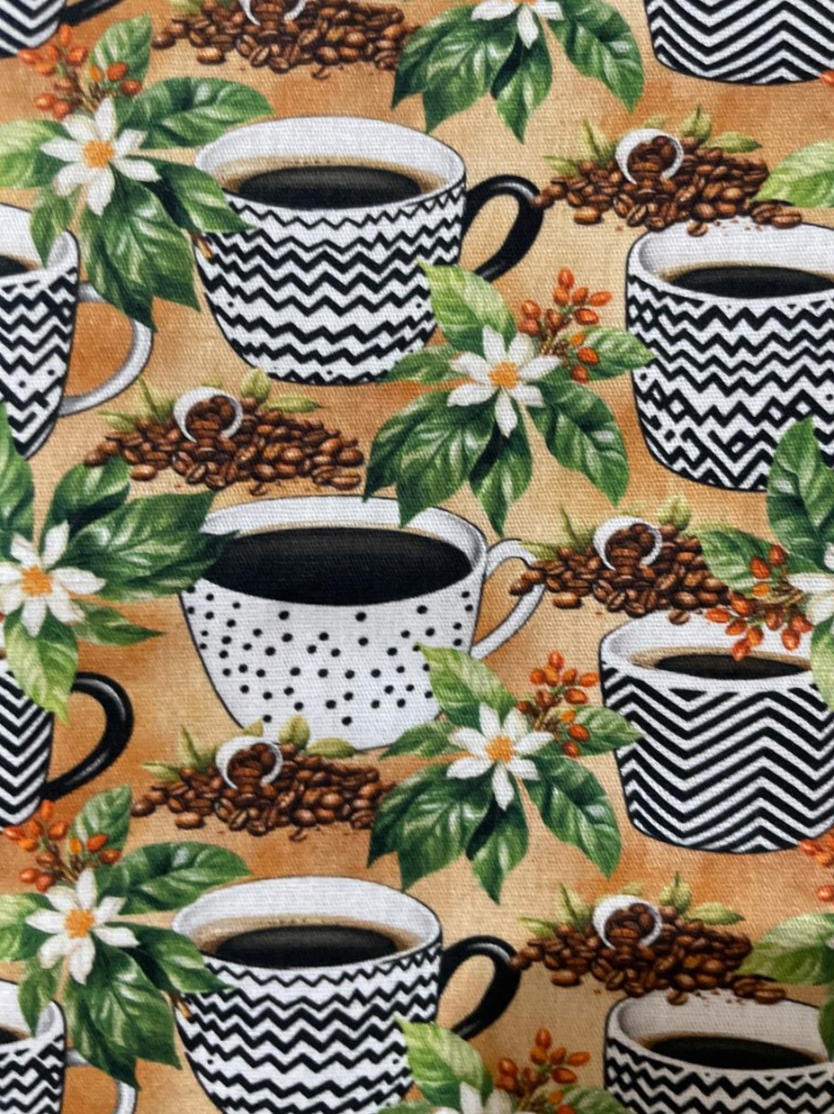 A tricoline de algodão com estampa de xícaras de café e ramos de café é muito bonita, um sonho! O tecido tem cores firmes e pode ser utilizado no vestuário e na decoração da casa. Crie aventais e vestes. Inove nas toalhas de mesa, guardanapos, suplás, jogos americanos e barrados. A estampa pode dar um toque especial na confecção de coordenados combinando com listrados e lisos.